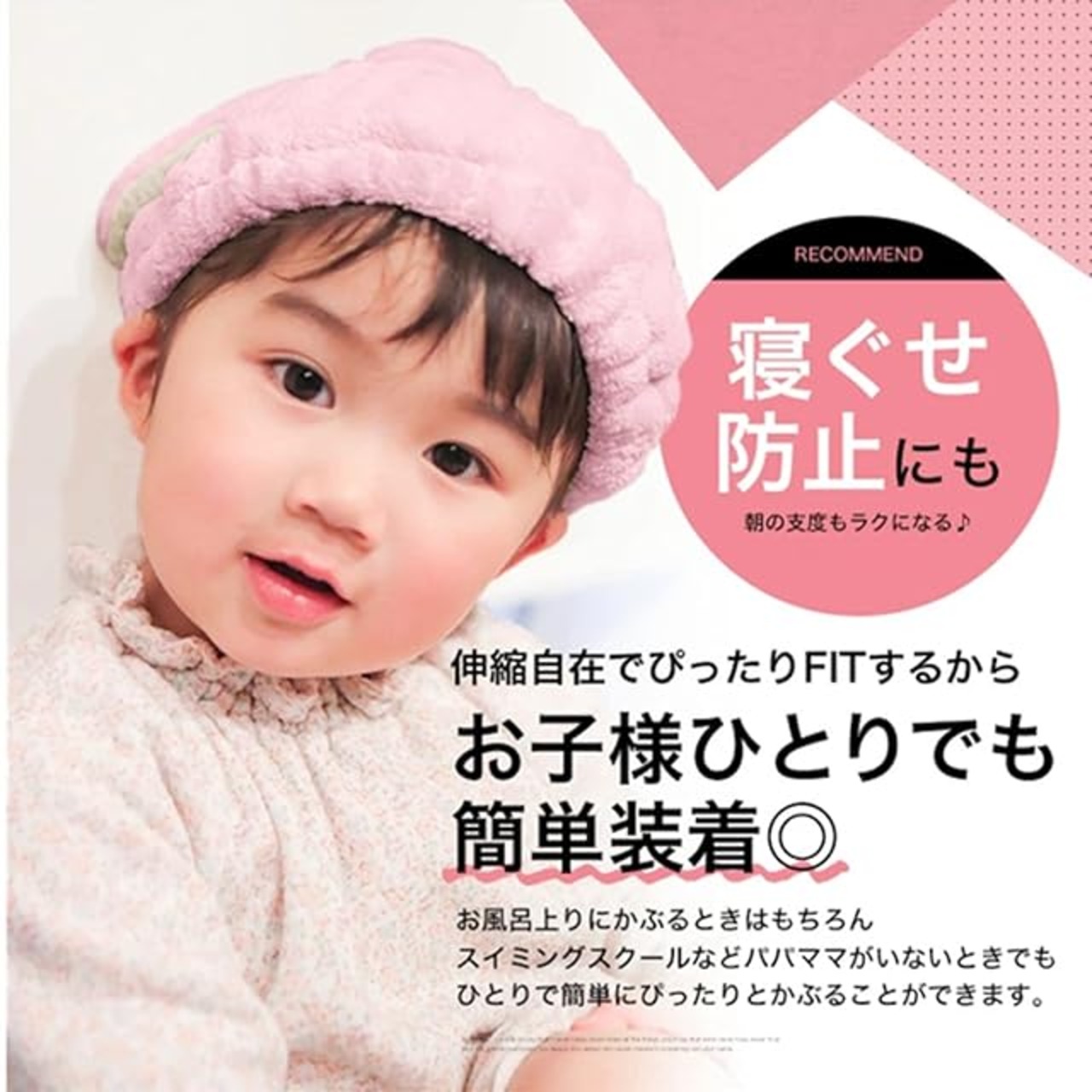 タオルキャップ:お風呂上あがり、優れた吸水力でドライヤーの時間を短縮でき、15分で髪の水分をしっかりと吸収してくれます。また、髪の摩擦や熱風によるダメージも防ぎます。