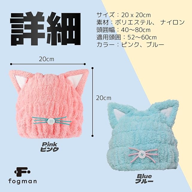 商品名:fogman タオルキャップ 子供 猫耳 ドライキャップ キッズ かわいい プール 速乾 大人兼用 (ブルー)