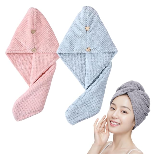 【二つのボタン付き・超軽量】ヘアタオルは2枚セットで、サイズは約65×25cm、一枚あたりの重量は約70gです。可愛らしい小熊のボタンが二つ付いており、髪の長さに応じて簡単に調整可能です。長くて太い髪も、しっかりと包み込んで離れません。お風呂上がりでも服が濡れる心配はありません。軽量で使いやすく、旅行にも持ち運びに便利です。