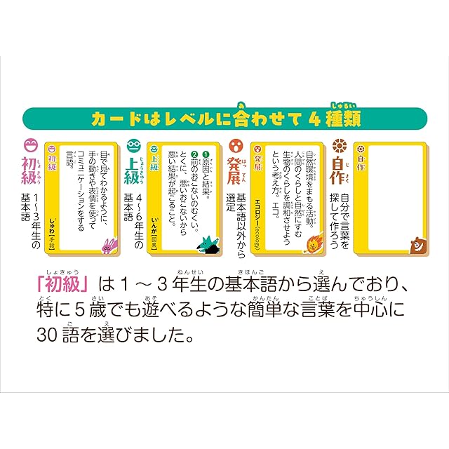 初級は、5才でも知っている言葉が入ってます。知らない言葉もありますが、言葉を知るキッカケに!実は教えるのも楽しいですよ ♪