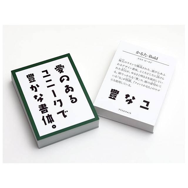 <br>遊び方概要:読み手を1人決め、取り札を場に広げます。プレイヤーに手番はなく、同時に競い合います。読み手は読み札のフォント名と解説文を読み上げ、プレイヤーは読み上げられたフォントが使われている取り札を探して早く取ります。残りの札が1枚になったら終了。より多くの札を獲得した人の勝ち。取った札の正誤は裏面に書かれたフォント名で確認できます。</br><br>書体一覧(48書体):かるた-Bold/AXIS Font コンデンス R/あさご本丸ゴシック Type3/朝日新聞明朝 R/アンチックAN+ R/A1明朝 R/MS ゴシック/勘亭流 U/きざはし金陵 M/玉刻華宋 W4/きりぎりす Regular/金文体 W5/けいふぉんとコミックレゲエ B/しねきゃぷしょん/秀英初号明朝 H/ZEN丸ゴシック M/創英角ポップ体/綜藝体 W7/たづがね角ゴシック Bold/淡斎古印体「歌」/筑紫AMゴシックL B/筑紫Q明朝L L/筑紫B丸ゴシック B/貂明朝 Regular/闘龍凸版文久見出しゴシック EB/ナール DB/Noto Sans JP Medium/Noto Serif JP Black/白舟太行書 B/パルレトロン B/ヒラギノ角ゴシック体 W3/ヒラギノ明朝体 W3/ふい字/プリティー桃 B/マティス EB/丸明オールド R/メイリオ レギュラー/モトヤ正楷書 W3/游教科書体 New M/游ゴシック体 M/UD新ゴ DB/UDタイポス 515 R/UDデジタル教科書体 R/游明朝体 M/LINE Seed JP Bold/ラグランパンチ UB</br>
