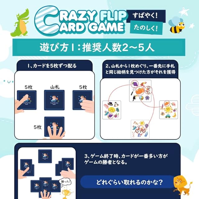 【遊び方1】推奨人数2~5人。 1、各プレイヤーに5枚ずつカードを配り、残りのカードは裏向きにしてテーブルの中央に置きます。 2、山札から1枚カードをめくり、全てのプレイヤーは自分の手札からめくられたカードと同じイラストを探し、先に見つけた方がそのカードを獲得します。 3、ゲーム終了時、手札のカードが一番多いプレイヤーが勝ちます。