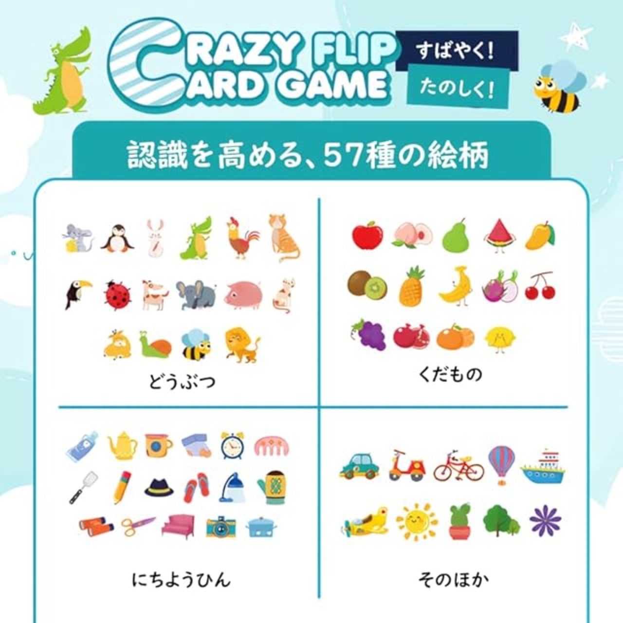 【ゲームの紹介2】57種類のイラストのうちの8つのイラストが描かれた54枚のカードで構成されており、他のカードと描かれている同じイラストを探すのが目的のカードゲーム。2種類の遊び方があり、5人まで同時に楽しめます。(仕様上、まったくかぶらないカードも何枚ありますので、予めご了承ください。)