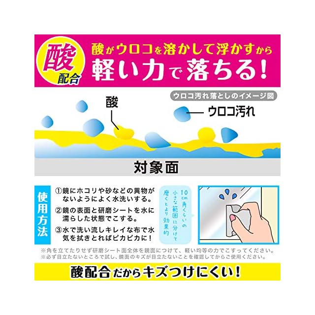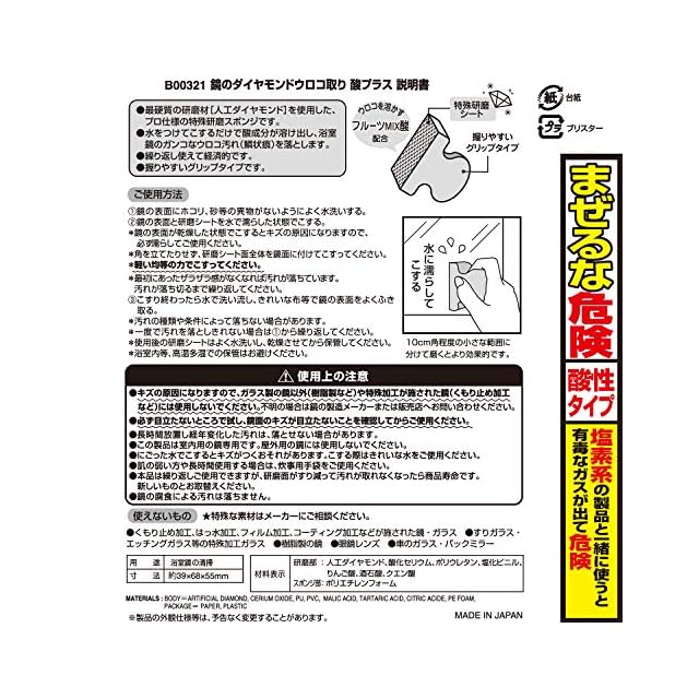 最硬質の研磨材「人工ダイヤモンド」を使用した、プロ仕様の特殊研磨スポンジ。鏡のガンコなウロコ汚れを強力に落とします!