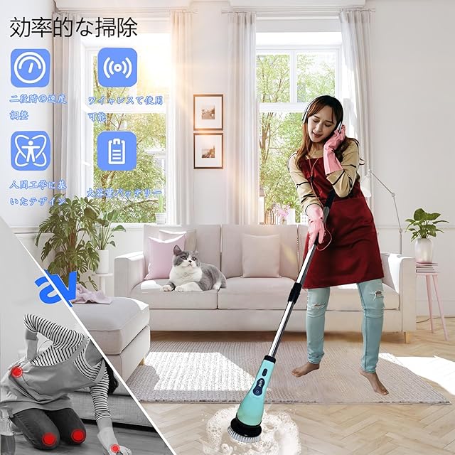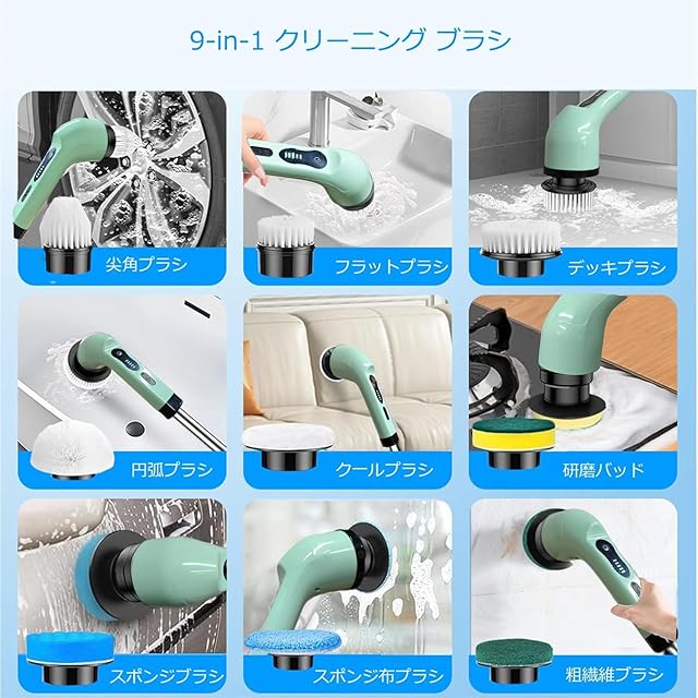 製品名:電動お掃除ブラシ9in1 製品説明: あなたの掃除時間をもっと楽に、もっと効率的に!電動お掃除ブラシ9in1は、便利な9つのブラシヘッドを備え、あらゆる場所の掃除に対応します。お風呂や浴室の頑固な汚れも、尖角ブラシを使えば簡単に隅々まで綺麗に磨けます。円弧ブラシは浴槽や洗面台に最適で、デッキブラシやフラットブラシは床の掃除にぴったりです。そして、スポンジブラシは窓の清掃に、大切な木の床やバッグにはタオルパッドが役立ちます。 また、研磨パッドを用いればキッチンもピカピカに。さらに、ウールブラシはソファや車の内装にも対応し、幅広い用途で大活躍します。ベルクロホルダーとフックが付属しているため、ブラシの取り外しも簡単。使い方はあなた次第、掃除のストレスを軽減し、快適な生活空間を手に入れましょう。 この電動ポリッシャーを使えば、掃除が楽しくなること間違いなしです!お風呂掃除から家庭の様々な場所のお手入れまで、是非お試しください。