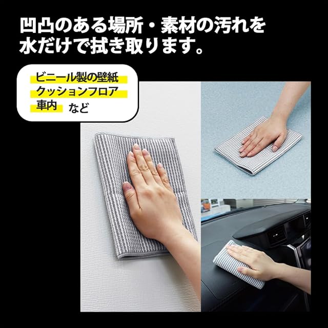 汚れのかき取り力に優れたW繊維と、細かい汚れまで拭き上げるマイクロファイバーを合わせたクロスです。水だけで壁紙の汚れ(手アカ・黒ズミ汚れ・ヤニ・クレヨン等)をしっかり落とします。
