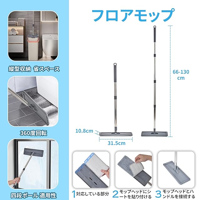 【長さ調整可能&360度回転モップヘッド】ハンドルは四本パイプがあり、身長や使用環境に応じて柄の長さを調整できます。これにより、自分に合った高さで、無理なく掃除作業ができます。また、モップヘッドは360度回転可能で、狭い隙間や家具の下など、通常のモップでは届きにくい隅々までも簡単に掃除でしっかり清掃できます。