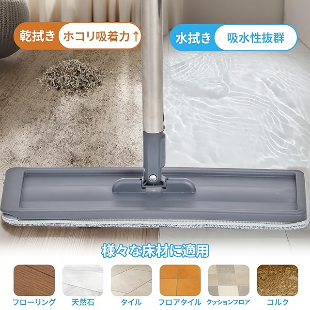 【乾湿両用】モップは強力な吸水性と埃への吸着力を備えており、乾拭き・湿拭きの両方に対応可能です。さまざまな床材に対応し、フローリングやタイル、カーペットなどで使用しても高い効果を発揮します。床面に付着した汚れやほこりをしっかりと取り除き、清潔感を保ちます。
