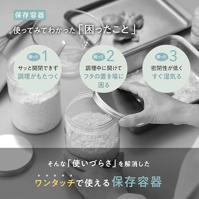 【いつでも開封したてのおいしさ】二つのパッキンでしっかり閉まって湿気を防ぎ、ワンタッチで開く保存容器。小麦粉1㎏が袋ごとピッタリ入るサイズです。