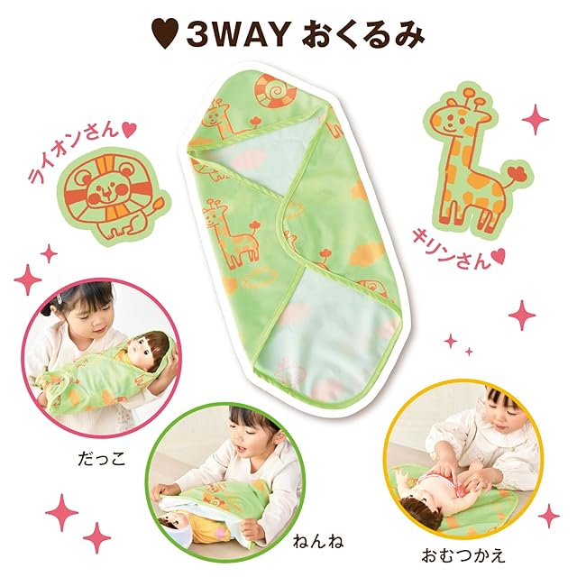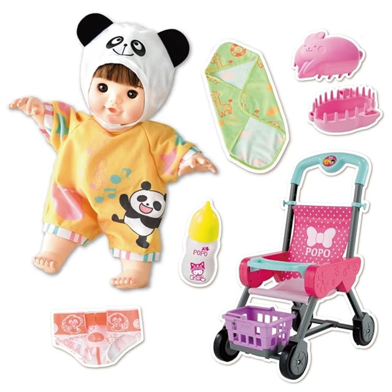セット内容:ふわふわボディのぽぽちゃん(ベビーロンパース、パンダさんぼうし)、お買いものベビーカー(Wフック、買い物カゴ、お世話テーブル付き)、うさぎさんのサラサラコーム、ごくごくミルクびん、赤ちゃんおむつ、3WAYおくるみ [パッケージサイズ]W397×D258×H345mm