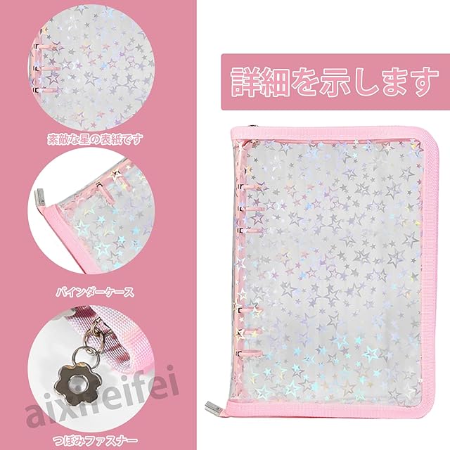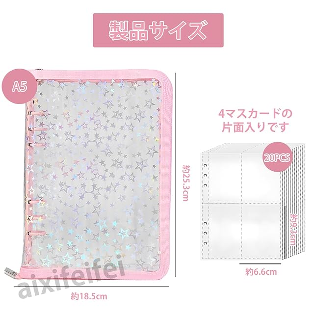 商品名:ADOFUN トレカケース A5サイズ 6穴バインダー 両面4ポケット リフィル20枚 推し活 オタ活 グッズ収納 星柄 システム手帳 持ち運び レインボー星柄( ピンク)
