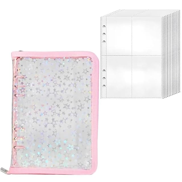 ADOFUN トレカケース A5サイズ 6穴バインダー 両面4ポケット リフィル20枚 推し活 オタ活 グッズ収納 星柄 システム手帳 持ち運び レインボー星柄( ピンク)