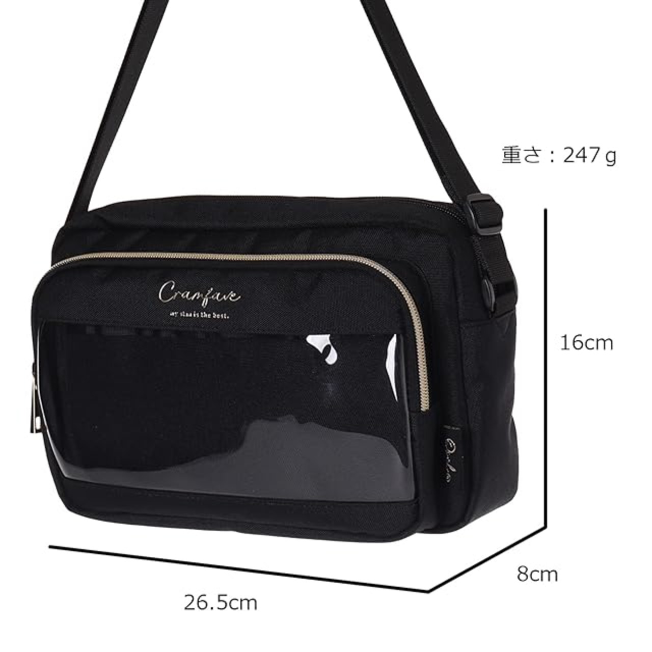 推せる幸せ★ 長さ調整可能なショルダーひも付きで便利♪ メイン収納口は中見え防止になるファスナータイプで安心です。 普段使い、お出かけや旅行のお供にも最適で、プレゼントにもおすすめです☆ 人気ゲーム機のスイッチをケースに入れてもすっぽりと入るサイズです。 その他、500mlペットボトル等も入ります★ クリア部分には推しグッズを入れるのにぴったり!! 独自のアレンジをお楽しみ下さい♪ ★★商品詳細★★高さ16cm×幅26.5cm×底マチ(メイン)5cm(前ポケット)3cm 247g ■メイン収納口:ファスナー ■ポケット:メイン口×1、外側ファスナーポケット×2 内側オープンポケット×2 ■前面ポケットはクリアタイプ(取り外し可能なシート付き) ■ショルダーひも:(約)66~126cm 長さ調節可能 幅(約)2.5cm ■缶バッジ2個付き ■素材・成分:ポリエステル、エナメル、PVC ■生産地:中国