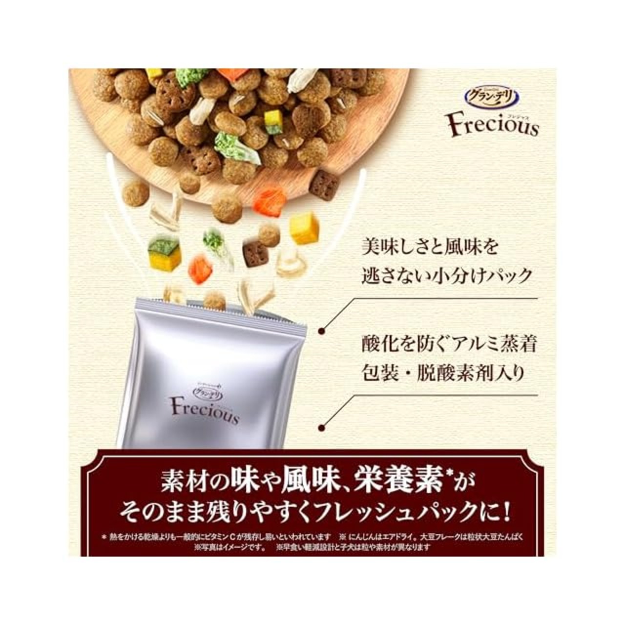 ドライ粒とフリーズドライ・エアドライの素材を、酸化を防ぐ鮮度維持包装をすることで、いつでも美味しくワンちゃんが喜びます