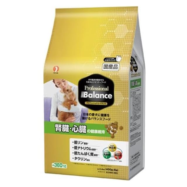 腎臓の健康維持にリン含有量を低減(高齢犬用比約10%カット)し、たんぱく質量も低減(高齢犬用比約10%カット)。腎臓・心臓の健康維持にナトリウム含有量を低減(高齢犬用比約50%カット)。心臓の健康維持にタウリンを配合。