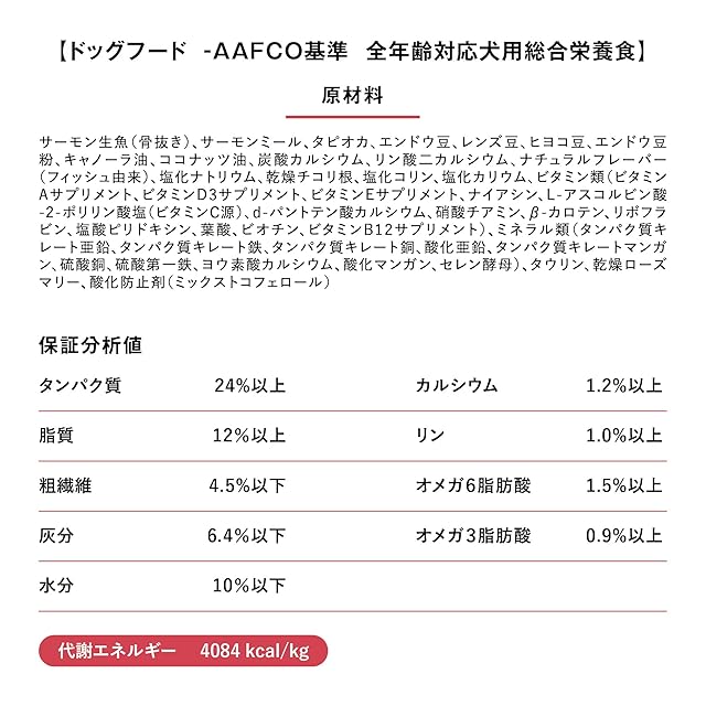 【LID グレインフリー サーモンレシピ】高品質なサーモンを唯一の動物性タンパク質として使用し、メインのタンパク質以外の食材もできる限り厳選。タピオカ、えんどう豆、レンズ豆、ヒヨコ豆とヘルシーな低GI食材のみを採用。