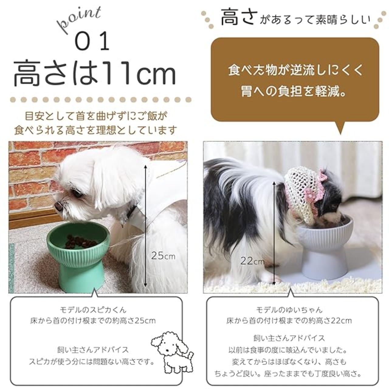 * 食べやすいように床からの距離を高くし、首や腰への負担を軽減するようにデザインされています。 ボウルの高さが11cmで、猫ちゃんが自然で負担の少ない体勢で食事ができます。