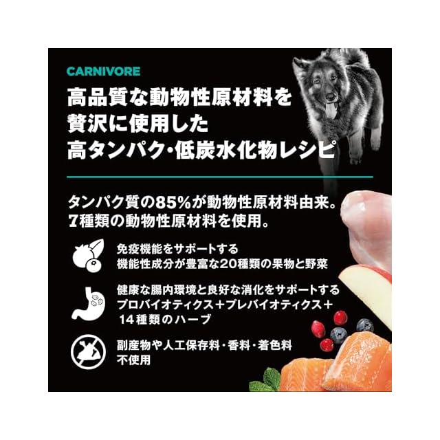 【お肉たっぷりの高タンパク・低糖質フード】タンパク質の85%が動物性原材料を使用。チキン・ターキー・ダックなど7種類のお肉、お魚を使用。運動量が多い、お肉が好き、筋肉を維持して引き締まった体型を目指したい、多彩な食材から栄養を取りたい、そんなお悩みに。