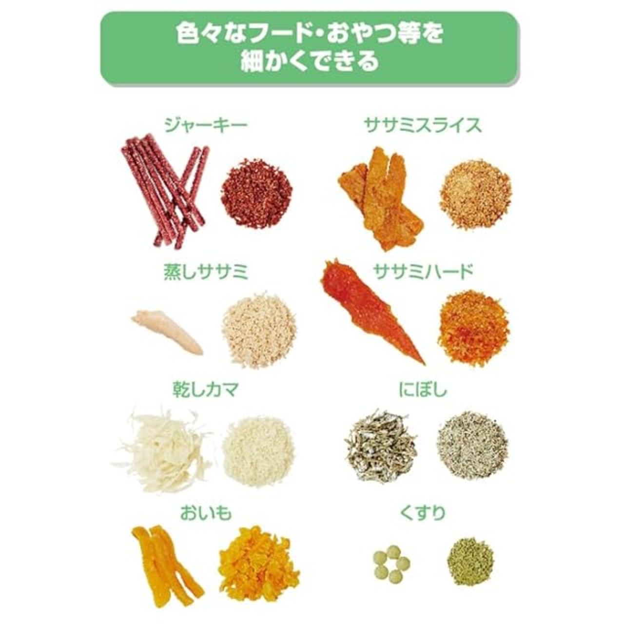 色々なフード・おやつ等を細かくすることで、苦手な食材やシニアや仔犬・仔猫も食べやすいように小さく与えたり、いつもの食事にアクセントとしてふりかけにしたり、手作りごはんにも便利。