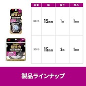【製品情報】使用温度範囲:-20~90℃ / サイズ(厚みx幅x長さ): 1mm x 15mm x 3m / 基材:高密度ポリエチレンフォーム / 粘着剤:アクリル系 / 仕様: 車内
