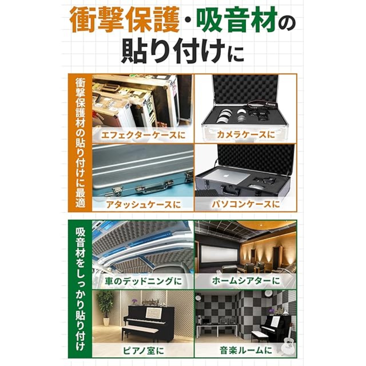 ⭕【 衝撃保護材、吸音材の貼り付けに最適 】 エフェクターケース、カメラケース、アタッシュケース、パソコンケースに使用する 衝撃保護材 の貼り付け用に。 車の デッドニング 、建物の ホームシアター 、 ピアノ室 、 音楽ルーム など壁面へ貼り付ける 吸音材 の貼り付け用としてお使いいただけます。