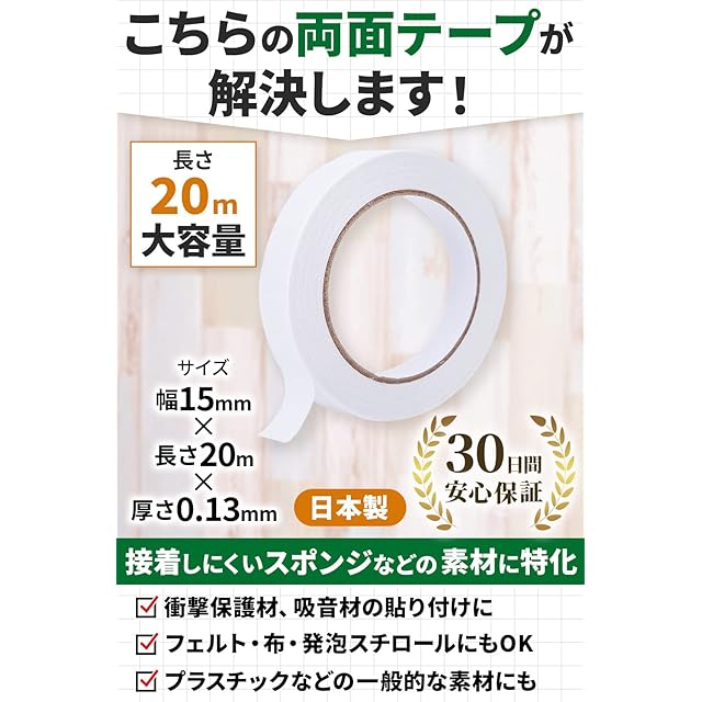 日本製【 接着しにくい素材に特化 】防音ファストラボ® スポンジ用 超強力両面テープ 15mm×20m 吸音材 緩衝材 ウレタン フェルト 布 発泡スチロール の貼り付けに