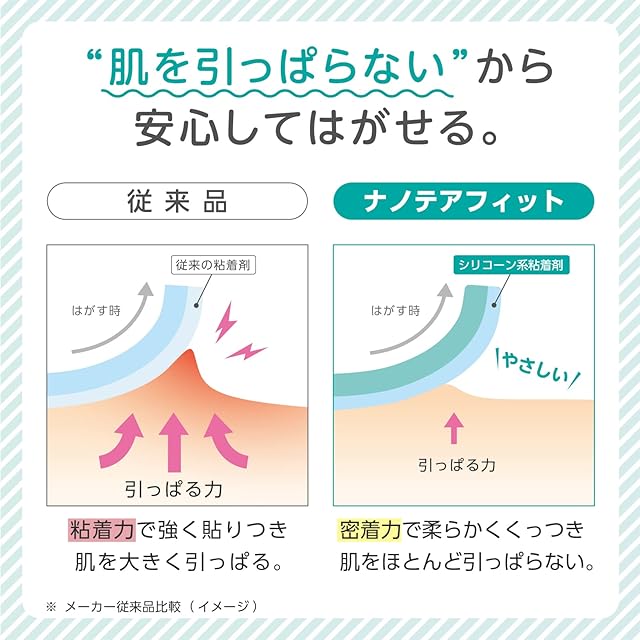 【肌を引っぱらない粘着剤】 テープを剥がすときに肌をほとんど引っぱりません。ナノテアフィットは従来のテープより肌負担を大幅に軽減します。
