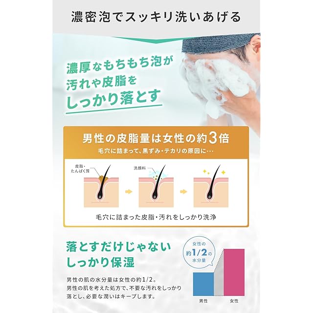 【男の肌悩みにアプローチ】 毛穴 の 黒ずみ 、 ニキビ 、 肌荒れ にしっかりアプローチ! 余分な 皮脂 をしっかりと落とせるので、顔の テカリ 対策にも! 濃厚な泡で スキンケア できる メンズ 洗顔