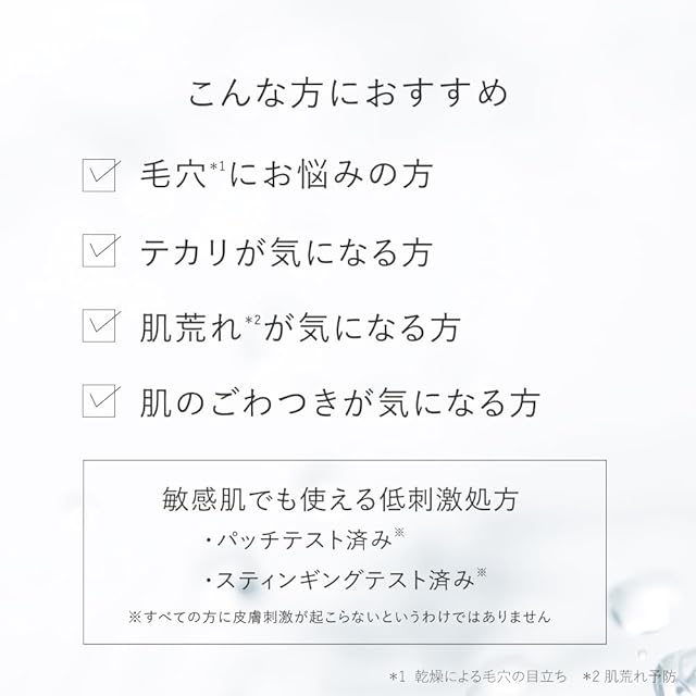 【こんな方におすすめ】毛穴が気になる方、季節問わずテカリが気になる方、脂性肌・混合肌の方、肌荒れでお悩み方、メイク崩れが気になる方