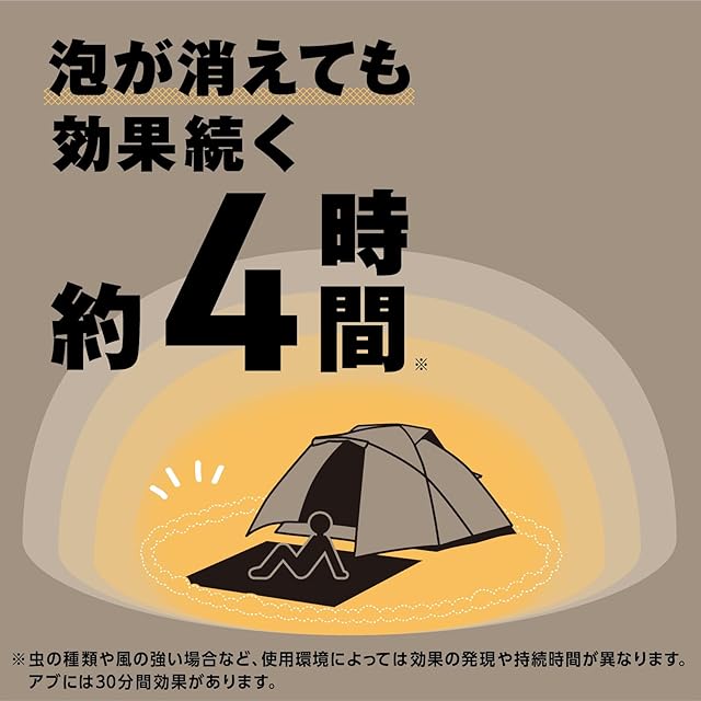 約4時間虫が気にならない空間をつくります。※虫の種類や風の強い場合など、使用環境によっては効果の発現や持続時間が異なります。アブには30分間効果があります。