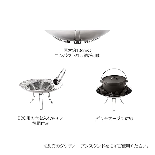 【おすすめ】地面への熱の影響を軽減するため、「ファイヤープレイスシート(別売り)」と一緒にご使用ください。ダッチオーブン使用時は「ダッチオーブンスタンド(別売り)」を必ずお使いください。