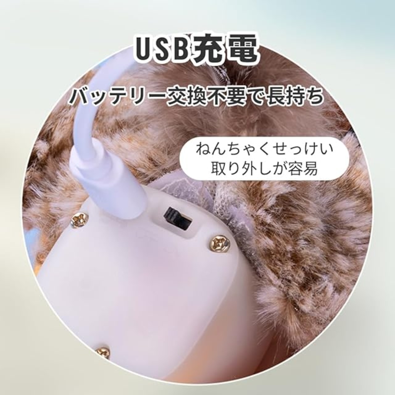 このおもちゃはUSB充電式なので、電池交換の手間とコストを省くことができます。USBケーブルはパッケージに含まれています。付属の充電機構は取り外し可能で、ぬいぐるみのペットのおもちゃを便利に掃除できます。
