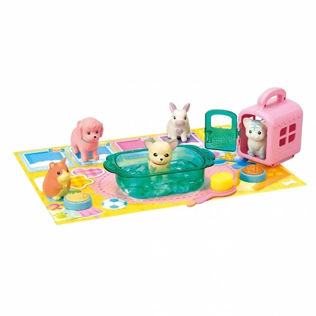 セット内容:トイプードル1匹、チワワ1匹、ネコ1匹、ウサギ1匹、ハムスター1匹、プレイシート1枚、まほうのバスタブ1個、まほうのブラシ・チップ1個、キャリーバッグ1個、ごはん2個、収納袋1枚