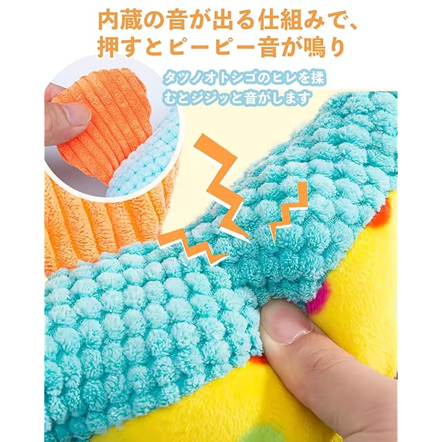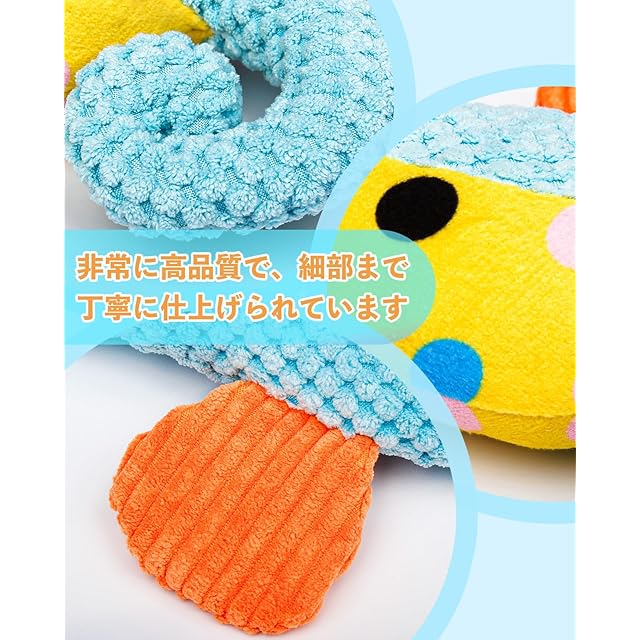 【内蔵音が出る発声装置で楽しいインタラクション】この犬用ぬいぐるみおもちゃには発声装置が組み込まれており、押すと「ピーピー」と音が鳴り、フィンを揉むと「ジージー」と音がします。犬の注意を引きつけ、楽しいインタラクションを楽しめます。