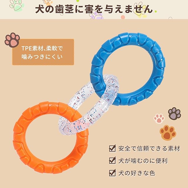 【多機能設計、使用時間が長い】この連結式ゴムおもちゃは、ボール、リング、チューブを 1 つに組み合わせた革新的なデザインが特徴です。犬は引っ掛けたり引っ張ったり、投げたり取って来たり、噛んだりなど、さまざまな方法で遊ぶことができます。特に小型なので狭いアパートにも最適で、狭いリビングでも安心して遊べます。厳格な品質基準に従って製造された TPR 素材は、耐久性がありながらも柔らかく、犬の歯や顎に優しい素材です。