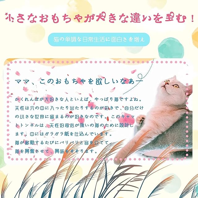 【サイズ】このトンネルは長さ120cm、2穴付き、S型の構造なので、猫ちゃんが思い切り快適に遊べます。猫ちゃんは適当に運動したら、退屈解消、食欲もよくになります。