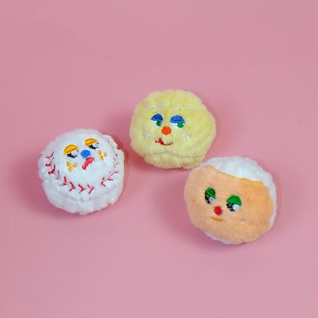 3種類のデザインがあり、それぞれ野球の要素や可愛らしい擬人化された表情を備えています。カラフルで明るい色合い、白・黄・オレンジと白の組み合わせなど爽やかな配色。ふわふわの素材は肌触りが良く、ペットに快適な触感体験を提供します。