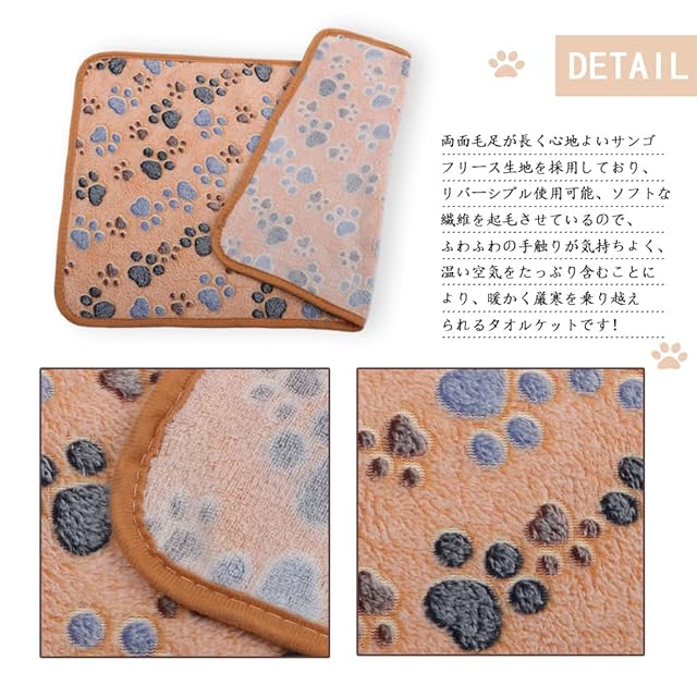 【ぽかぽか暖かい素材】やわらかな極上の肌触りがたまらない可愛いペットブランケットで、わんにゃんと一緒に寒い秋冬を快適に過ごしましょう!両面毛足が長く心地よいサンゴフリース生地を採用しており、リバーシブル使用可能、ソフトな繊維を起毛させているので、ふわふわの手触りが気持ちよく、温い空気をたっぷり含むことにより、暖かく厳寒を乗り越えられるタオルケットです!通気性がいい特徴で、季節を問わずオールシーズンにもお使いいただけます。
