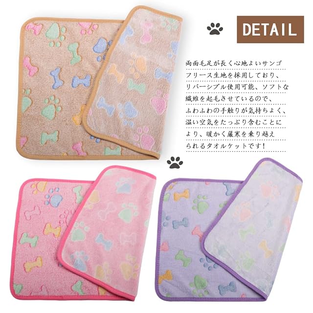 【ぽかぽか暖かい素材】やわらかな極上の肌触りがたまらない可愛いペットブランケットで、わんにゃんと一緒に寒い秋冬を快適に過ごしましょう!両面毛足が長く心地よいサンゴフリース生地を採用しており、リバーシブル使用可能、ソフトな繊維を起毛させているので、ふわふわの手触りが気持ちよく、温い空気をたっぷり含むことにより、暖かく厳寒を乗り越えられるタオルケットです!通気性がいい特徴で、季節を問わずオールシーズンにもお使いいただけます。