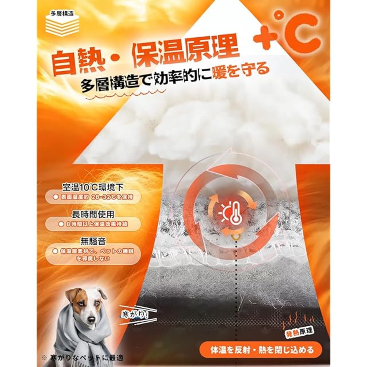 ペットあったかマット【電気不要】:ペット自身の体温を効率よく反射し、穏やかな温もりを保ちます。電気コードや電源が一切不要なので、感電のリスクがなく、室内外を問わず、安心してお使いいただけます。愛するペットのための、安全で心地よい保温環境をご提供します。