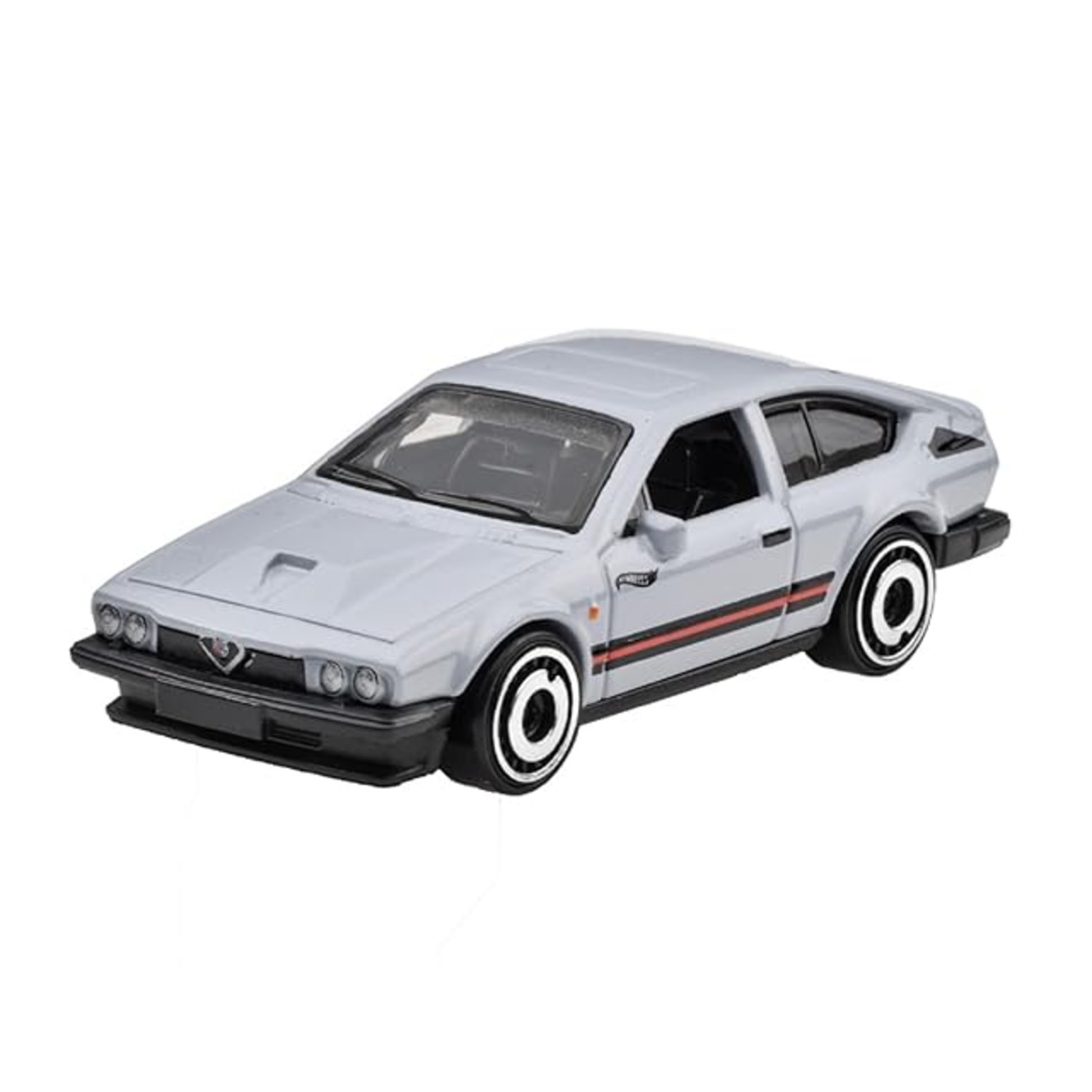 【内容】ホットウィールがモチーフとしたのは、「小さなアルファロメオ」というニュアンスであるアルフェッタと名付けられた、同社の中型車のクーペモデルのGTである。アルフェッタは本来車体の前方寄りにエンジンと一体化してマウントされる重い変速機を、後輪のデフ(差動装置)と結合して搭載し、車両の前後重量愛分を均一に近くするといった工夫が凝らされていたことでも知られる。アルフェッタGTは年々高性能化が図られ、排気量拡大版、ターボモデル、さらにはそれまでの直列4気筒車に加えて、V型6気筒車も追加されている。今回、ホットウィールが再現したのは、その中でも200台強のみ南アフリカで販売された178馬力を発生する3.0リッターV6搭載車の超レアモデルだ。