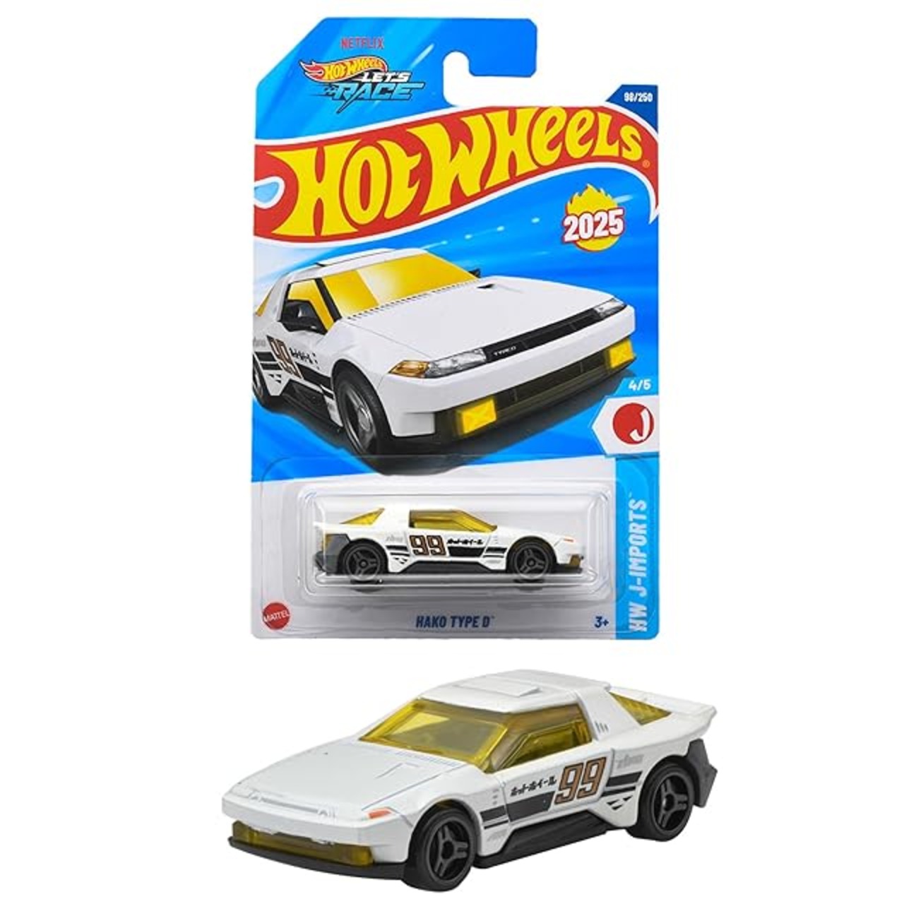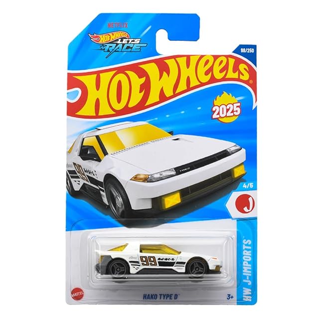 【内容】1980年代の日本車と、日本のカスタムカー文化にインスピレーションを得てデザインされたホットウィールのオリジナルカーがハコ タイプD。当時を知るクルマ好きならば、トヨタのAE86型スプリンター トレノやカローラ レビン、AW11型MR2、FC3S型マツダ RX-7などの影響を強く感じるスタイリングが印象的だ。HAKOは箱のようにエッジの効いたデザイン、タイプDの「D」にはドリフトのニュアンスが込められている。サイドウィンドウの一部が切り欠かれるように開閉するデザインはスバルのアルシオーネSVXやトヨタ セラを思わせるなど、昨今のホットウィールの日本車愛を感じるもの。今回のデビューカラーはホワイトのボディにブラックのストライプが入り、AE86型で言うところのパンダツートン(正式名称ハイテックツートン)を彷彿とさせ、蒐集欲を大いに刺激してくれる。
