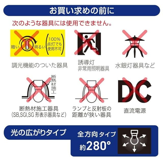 ≪ご注意≫※ 次のような器具には使用できません。・ 調光機能のついた器具(100%点灯でも使用不可)・ 誘導灯、非常用照明器具・ 水銀灯器具など・ 断熱材施工器具(SB、SGI、SG形表示器具など)・ ランプと反射板の距離が狭い器具・ 直流電源※ このほか使用器具の種類によって寸法的、熱的、その他の状況(リモコン機器のついた器具など)により使用できない場合があります。※ ご使用になられる照明器具の構造によっては、放熱不良で短寿命となることがあります。※ 密閉器具でのご使用の場合、器具の寸法により、使用できない場合や寿命が短くなる場合があります。※ 人感スイッチなど自動点滅装置や遅れ停止スイッチなどには使用できない場合があります。※ 交流100V、周波数50/60Hz以外の電源では使用しないでください。※ ランプ周囲温度が40℃を超える場所では使用しないでください。
