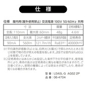 【 仕 様 】■ 寸法:全長110mm、最大径60mm■ 質量:48g■ 定格消費電力:4.6W■ 定格入力電流:90mA■ 全光束:560 lm■ エネルギー消費効率:121.7 lm/W■ 平均演色評価数:Ra83■ 定格寿命:40000h※ 推奨使用器具:ダウンライト、スポットライト、シーリング、ペンダント、シャンデリア、スタンド、ブラケット※ 屋内用(屋外使用禁止)※ 交流電源 100V 50/60Hz 共用