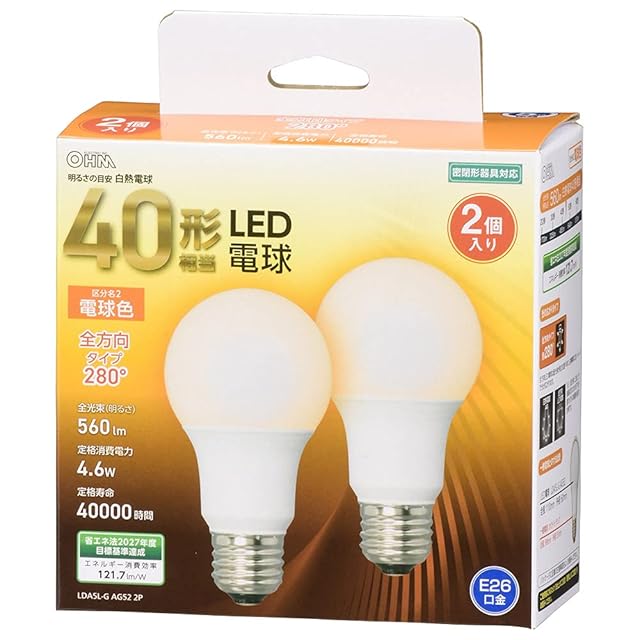 商品名:オーム(OHM) LED電球 E26 40形相当 電球色 全方向 2個入 オーム電機 LDA5L-G AG52 2P 06-4704