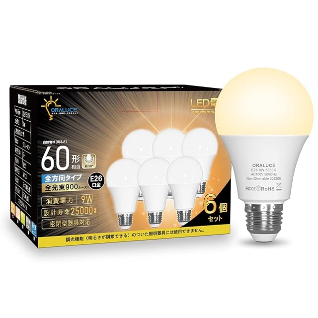 商品名:ORALUCE LED電球 E26口金 9W 900lm 60W形相当 高輝度 電球色 3000K 広配光タイプ 高演色 省エネ 密閉形器具対応 調光不可 6個入