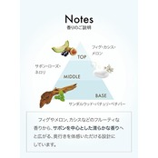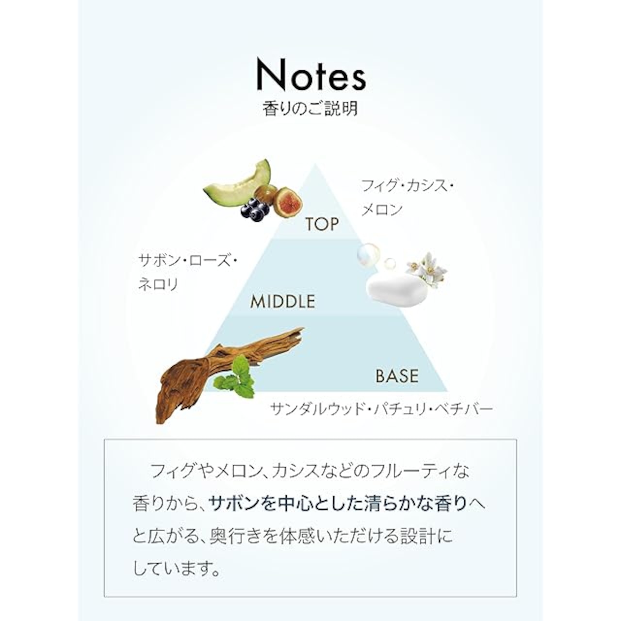 爽やかさと奥行きのあるサボンの香り。フィグやメロン、カシスなどのフルーティな香りから、サボンを中心とした清らかな香りへと広がります。