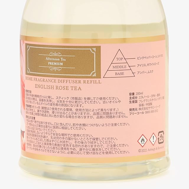 イギリスのアロマフレグランスメーカー「アシュレイ&バーウッド」へ依頼して作ったAfternoonTeaオリジナルディフューザーのリフィルです。<br>お茶をテーマにした大人気の香りがリフィルになって登場しました。容器の中身を専用のボトルに移し替え、市販のスティックを挿してご使用いただけます。芳香期間は約3ヶ月。<br>ご自身のお部屋やリビング、玄関などお好きな場所に置いてやさしく広がる香りをお楽しみください。<br><br>・WHITE TEA(ホワイトティー)<br>繊細かつ上品なバイオレットやリリーを使用したホワイトティーの香り。シトラスノートのベースで清潔感も感じられる、心ときめくやさしい香りが楽しめます。<br>・GREEN TEA(グリーンティー)<br>茶葉の清涼感をジャスミンやベルガモットで表現したグリーンティーの香り。フレッシュで心地よい香りが気持ちを穏やかにしてくれます。<br>・ENGLISH ROSE TEA(イングリッシュローズティー)<br>ムスクとアンバーが、主役のホワイトローズを引き立てるエレガントで優雅な香り。心が浄化されるようなピュアでやさしい香りが広がります。<br><br>*香りの持続時間はご使用状況、室温によって変わりますが、約3ヶ月が目安です。