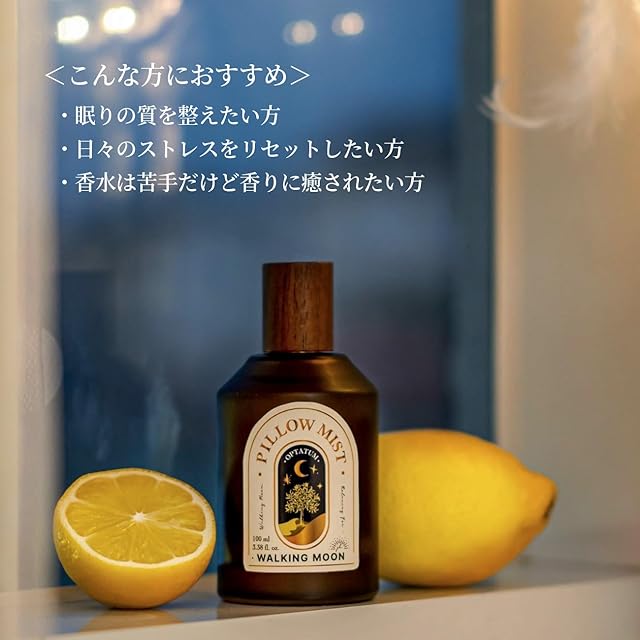 <オプタウム ピローミスト ウォーキングムーン><br> <br> 一日の終わり、枕にひと吹き。<br> 「ウォーキングムーン」は、澄んだアクアと爽やかな柚子がシックなアンバーウッディにつながり、 長い余韻を残すシトラスの香り。<br> 温もりのあるゆずの香りが、穏やかな眠りへと誘います。<br> <br> 就寝前の新しい習慣として、日々のストレスを香りで整えるナイトルーティンを。<br> フランス産のファインフレグランス配合で、寝室を心地よい癒しの空間に変えてくれます。<br> <br> <br> 心地よい眠りを誘う、穏やかな香りのピローミスト<br> 睡眠環境を整えるために生まれたピローミスト。香料濃度を抑えたやさしい香りが、主張しすぎず穏やかに広がります。<br> オフィスやデートなど日常のシーンでも使いやすく、心をリラックスさせる控えめな香りは、寝室でのリラックスタイムにぴったり。<br> <br> ほのかなアロマがあなたを包み込み、心地よい眠りへと導きます。オプタウムならではの洗練された香りで、心身ともに癒しのひとときを。<br> <br> <br> ウォーキングムーン<br> TOP:マンダリン、グリーン、アクア<br> MIDDLE:グレープフルーツ、ベルガモット、ジャスミン、マグノリア<br> BASE:ユズ、アンバリー、ムスク<br> <br> <br> 上品で心地よい香り<br> ひとつひとつ手作業で、フランス産エッセンシャルオイルとファインフレグランス香料を<br> 使ったこだわりの調香で、長持ちする高品質の香りが楽しめます。<br> <br> <br> 安心して気持ちよく<br> 専門機関の試験により、肌への刺激が少ないことが確認されています。<br> 低刺激処方のため、長時間肌に触れる寝具にも安心してお使いいただけます。<br> <br> <br> 香りだけでなく、空間をクリーンに<br> ただ香りをまとうだけでなく、寝具やお部屋のこもったニオイをすっきりリセット。<br> オプタウム ピローミストは、心地よい香りとともに、清潔感あふれる空間を叶えます。<br> <br> <br> こんな方におすすめー★ <br> ◇寝付きが悪く、寝るまでに30分以上かかる <br> ◇寝る前に癒されたい <br> ◇安眠できる部屋を作りたい <br> ◇睡眠の質が良くないと感じる方<br> ◇刺激の少ないルームミストをお探しの方<br> ◇朝まで香り続けるピローミストをお探しの方<br> ◇香水は苦手だけど香りに癒されたい方<br> ◇プレゼントにおすすめなアイテムをお探しの方<br> <br> 上質な眠りを求めるあなたに、特別なナイトフレグランスを。<br> <br> <br> フレブランスブランド OPTATUM(オプタウム) <br> オプタウムはプレミアムな香りと日常に特別な感性を追求する、ラグジュアリーヴィンテージコンセプトのフレグランスブランドです。<br> 「大切な人におくる価値のある製品だけ作ろう」というコンセプトのもと、19世紀イギリスの華やかさとヴィンテージ感を表現しています。<br> <br> <br>