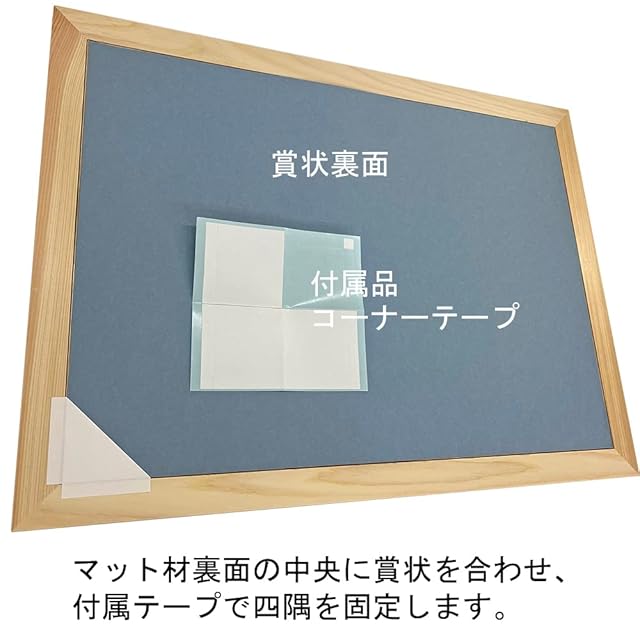 横向きの吊紐金具・紐・賞状固定用の専用テープ・ダンボールのかぶせ箱付き。額縁の裏に紐は付属しておりますが、額受金具や額立てなどは飾る場所に合わせて別途お求めください。[別途、額立てをお買い求めいただく際は高さ350Hが推奨です]